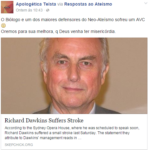 Um dos mais conhecidos militantes do neo-ateísmo, Richard Dawkins, foi acometido na véspera da turnê da divulgação do seu livro "Brief candle in the dark", de um Acidente Vascular Cerebral (AVC).